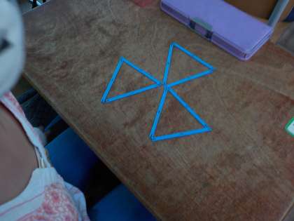 算数の学習で,かたちづくりをしています。棒や色板を使ってたくさんの形を作ることができました。その時に,色板を何枚使ったのか,棒を何本使ったのかを考えながら形を作ることができました。形をまねしたり,自分たちで考えて作ることをとてもよく楽しんでいました。