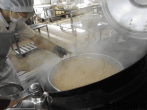 ★学校では,大豆は乾燥したものを使っています。朝から,お湯につけ,煮ています。