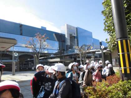 京都タワー前に到着。子どもたちは目の前の京都タワーを見上げています。「高いな〜」「これ今から登るの?」と子どもたちは驚いていました。