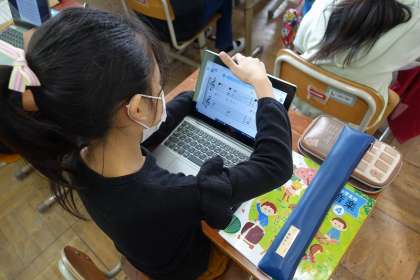 音楽の学習では,リコーダーの練習をしています。2つのパートに分かれて,音色が重なる美しさを感じ取りました。学習の最後に,演奏をするときの工夫を考えて,楽譜に書きこみました。