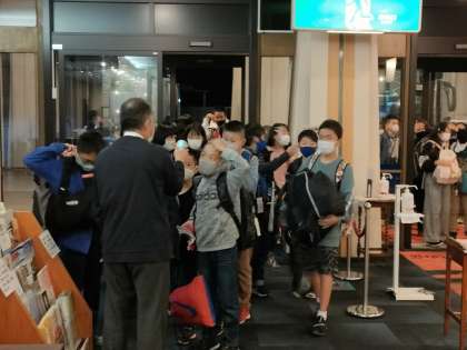 バスでホテルまで移動しました。途中には,月食も見ることが出来ました。消毒や検温もしっかりしています。みんな元気にホテル到着です。