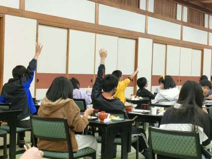 感染症対策で,みんなでワイワイお話をしながらの食事はできませんが,みんなマナーを守っておいしくいただきました。御飯のおかわりのために手を挙げている人が,沢山いました。明日に備えて,しっかり食べていました。