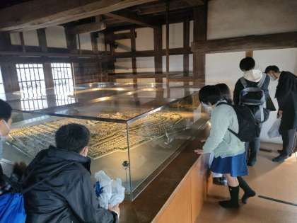 姫路城の急な階段を上り,お城のつくりや防御のための工夫などを見学しました。展示物を見たり,窓からの景色なども堪能したりしていました。お天気も良くて,見晴らしもよかったです。