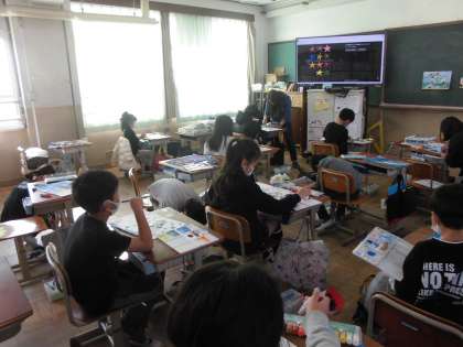 図画工作科「いろいろうつして」の学習では版を刷った後,絵の具で色付けをしました。自分なりに想像して,より良い作品にしようと取り組んでいました。