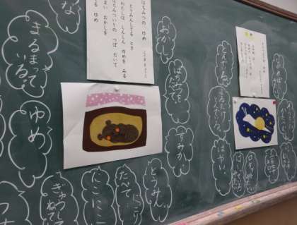 国語の学習では「こえにだしてよもう」の学習で,詩をみんなで読みました。「かたつむりが空を飛んでるよ。楽しそう。」「くまさんははちみつが好きなのかな」とみんなで想像を膨らませながら学習していました。