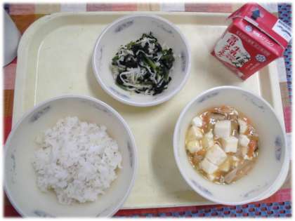 今日の給食は麦ごはん,牛乳,五目どうふ,切干大根のいためナムルです。