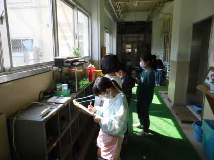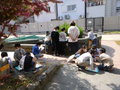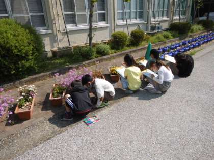 春になって,植物や動物などの生き物がたくさん見られるようになりました。校庭で生き物を探して気づいたことを話し合っています。