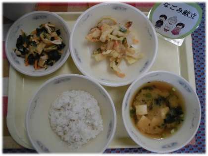 今日の給食は麦ごはん,たけのこのかきあげ,小松菜の煮びたし,みそ汁です。