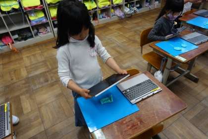 完成した作品は,GIGA端末を使って写真を撮りました。初めて使ったロイロノート,しっかりと話を聞いて,全員写真を提出することができました。