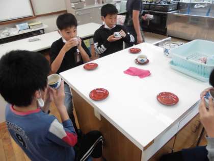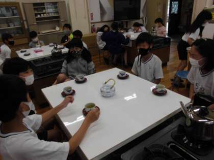 グループの人の分を湯飲みにいれた後には,味や香りを楽しみました。