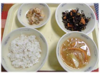 今日の給食は,麦ごはん,牛肉とひじきのいため煮,たけのこのおかか煮,春野菜のみそ汁です。