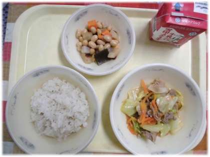 今日の給食は麦ごはん,牛乳,豚肉とキャベツのみそいため,五目煮豆です。