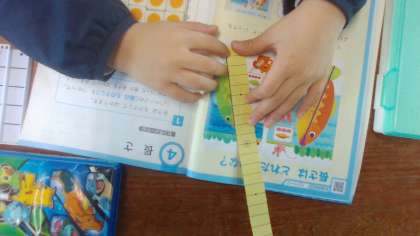 今日から,算数では「長さ」の学習がはじまりました。数図ブロックやものさしなどの同じもので比べないと長さを比べることができないことを発見したり,「センチメートル」の書き方をたしかめたりしました。