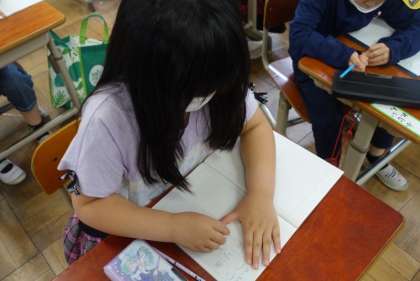 これまでに学習したひらがなから始まる言葉を,見つけました。見つけた言葉は,ノートに書きました。