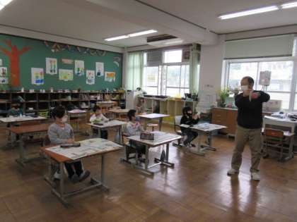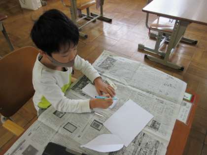 図工の時間に,掲示板に掲示するはっぱを作りました。葉っぱの作り方の説明を聞いた後,葉っぱの形を作りました。子どもたちは,ハサミを使って上手に葉っぱの形に切ることができました。