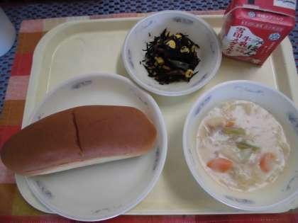 今日の給食は黒糖コッペパン,牛乳,キャベツのクリーム煮,ひじきのソテーです。