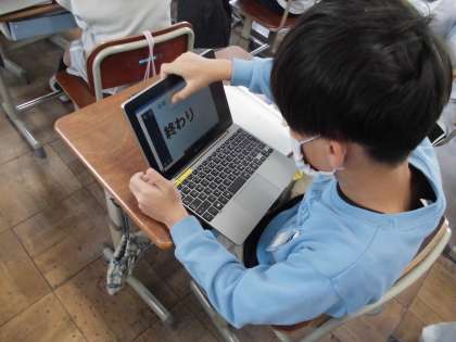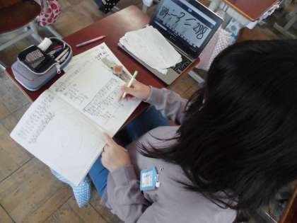 1けたでわるわり算の筆算の学習をしています。筆算の手順をノートに書き,ロイロノートを使って共有したり,自分の考えを説明したりしました。