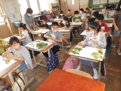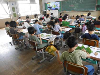 3年生がビニール袋を片手に集めていたもの。それは,様々な色や形をした『葉』でした。それを使って,自分の見方を広げる学習を行いました。