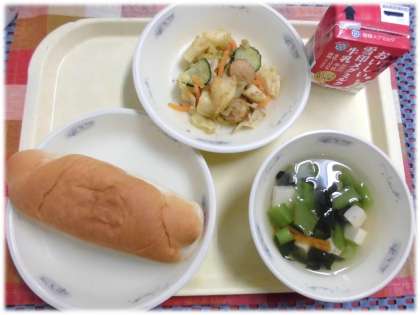 今日の給食は味つけコッペパン,牛乳,ソーセージと野菜のいためナムル,とうふと青菜のスープです。