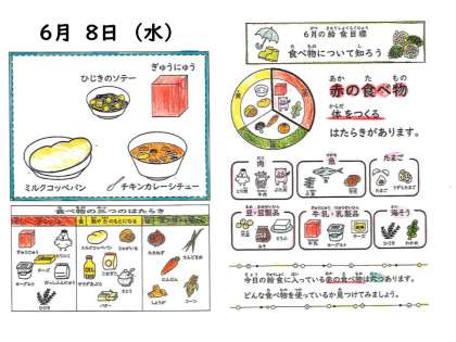 チキンカレーシチューは,カレー粉の入ったシチューです。休み時間に給食カレンダーを見た子どもたちは「シチュー?カレー?」「カレーとちがうの?」と興味津々でした。