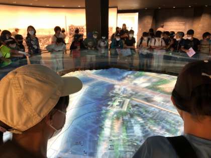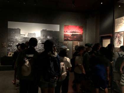 グループごとに、広島平和記念資料館の展示を見学しました。原爆のこと、原爆がもたらした被害のこと、被害を受けた方々の手紙などの沢山の資料から、一人一人が感じ取り、学んでいました。手紙や写真を見て、『泣けてくる』『こんなにひどいのか』と呟く子もいました。一所懸命メモしている子も多く、学ぶ姿勢が素晴らしいと思いました。