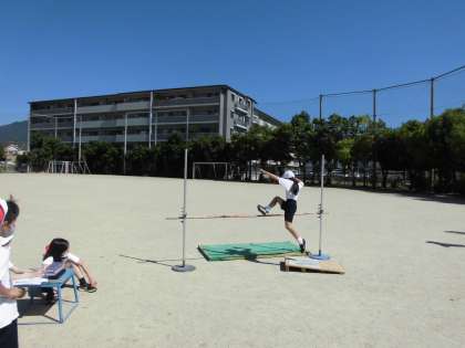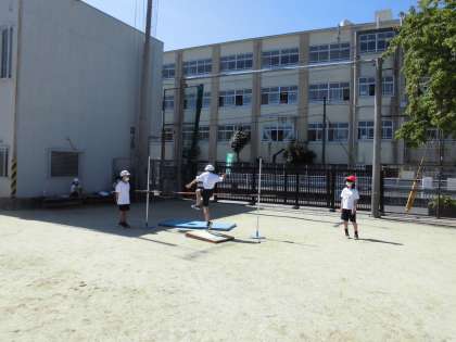 踏み切りや足の振り上げ方に意識して,高跳びを行いました。目安となる記録まであと少しという人もいました。安全に気をつけて,準備や片付けもできていて,素晴らしかったです。