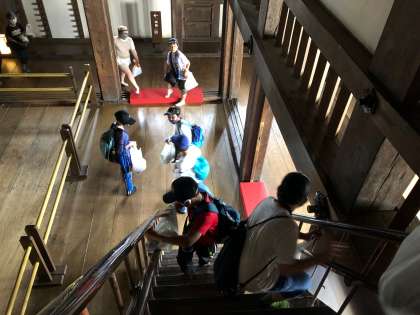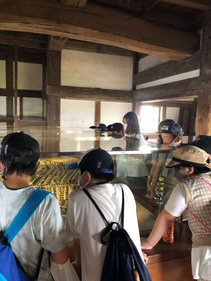 姫路城の天守閣に登りました。敵に攻め込まれた時に城を守る工夫が、あちらこちらにありました。気がついて教えてくれる子もいて、良く見ているなぁと感心しました。頭を打ちそうな急で狭い階段を登っていくと、綺麗な城下町が見えました。昔のお殿様は、どんな景色を見ていたのでしょうね。急な階段を降りるのも、一苦労でした。
