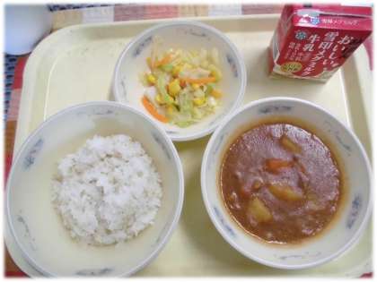 今日の給食は,麦ごはん,牛乳,ブラウンシチュー,野菜のソテーです。