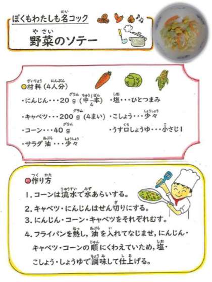 給食時間に教室をのぞいてみると,「野菜のソテー」がとても人気で,「シャキシャキしている」や「あまい味がしたよ」などいろんな感想を聞かせてくれました。子どもたちのリクエストより,野菜のソテーのレシピを掲載しています。ぜひご家庭で一緒にお試しください。