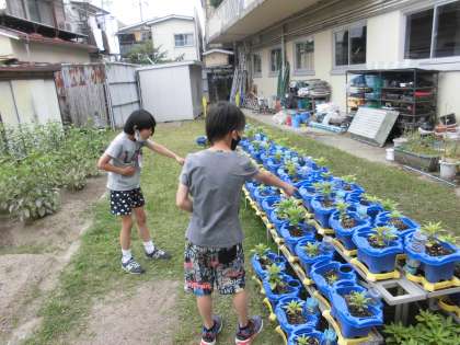 嵯峨野ファームを通りかかると,3年生児童が何やら植物を鑑賞しています。理科で育てているオクラ・ホウセンカ・ひまわりです。放課後にまで育てている植物を鑑賞するなんて・・・。植物に愛情深い3年生でした
