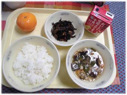 今日の給食は,ごはん,牛乳,夏野菜のあんかけごはん(具),ひじきの煮つけ,みかんです。