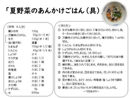 「夏野菜のあんかけごはん(具)」は,京野菜の一つ「万願寺とうがらし」を使った献立です。万願寺とうがらしは,京都府北部の舞鶴市にある万願寺地区で誕生しました。「とうがらしの王様」と呼ばれるほど肉厚で大きく,独特の風味が感じられます。あまみがありやわらかいため,子どもも食べやすいとうがらしです。