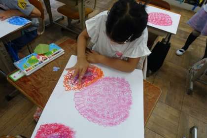 花の形が描けると,指でこすって花びらに色をつけていきます。