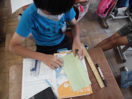 平行の学習をして,平行な2つの直線の特徴を考えました。2つの直線のはばを測ってみると…どこも長さが等しいことに気づきました。