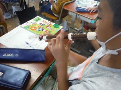 リコーダーでは,さらに新しく「ド」「レ」の音を出せるようになりました。どんどん新しい音に挑戦していっています!がんばって運指を覚え,きれいな音色で演奏できるようになってください!!