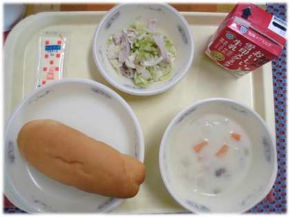 今日の給食は,コッペパン,牛乳,ハムサンド(具),チャウダーです。