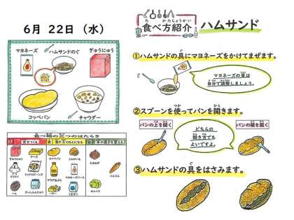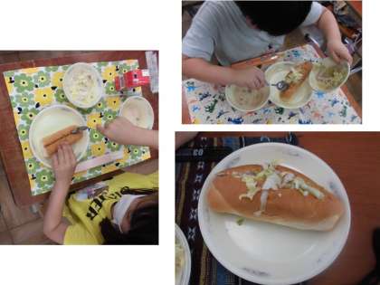 ハムサンド(具)は,パンに切れ込みを入れ,自分でパンにはさみます。それぞれオリジナルのハムサンドが完成していました。
