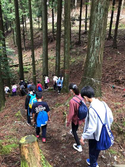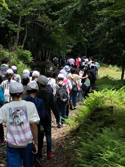 入所ハイキングをして、山の家に向かいました。2列で歩ける登りの道の後、1列で足元に気をつけながらゆっくりゆっくりと歩く下り道へと進み、山の家に到着しました。