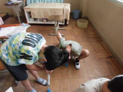 閉じ込めた水について,実験をしました。加えた力の大きさと体積の関係を調べると…空気とはまた違った結果が出て,驚いていました。
