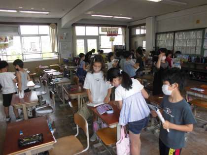 外国語活動の学習で,すきな数だけりんごに色を塗り同じ数のりんごを持っている友達を見つける活動を行いました。