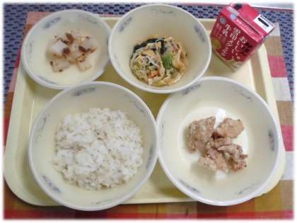 今日の給食は,麦ごはん,牛乳,鶏肉のこはくあげ,かみなりこんにゃく,もやしの煮びたしです。