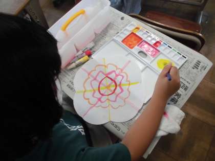 水をたっぷり混ぜた絵の具を使って,和紙に模様を描いて,