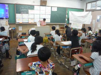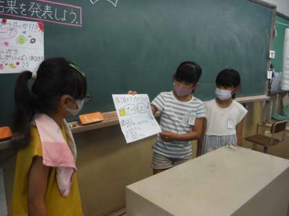 アンケートやインタビューをした結果を発表しました。「ビオトープ」と「芝生」が『すてき』投票の上位に入りました。他の学校にはあまりない芝生と自然いっぱいのビオトープ,「嵯峨野小学校はいいねぇ〜」と嵯峨野の『すてき』を感じることができました。