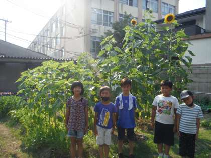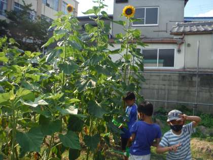 3年生が育てているひまわりがぐんぐん育ち,きれいな花を咲かせています。今日はひまわりと背比べをしました。