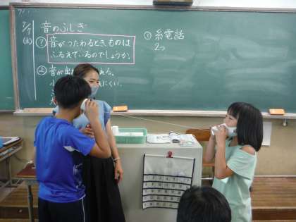 理科では「音のふしぎ」の学習をしています。今回は「音が伝わるとき、ものはふるえているのか」について調べました。糸電話を作り調べました。