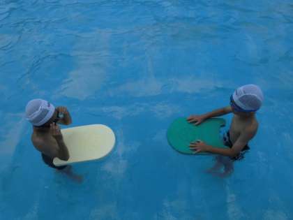 水泳学習では,バディ(ペア)を組んで学習を行っています。相手の安全を確かめる役割だけでなく,互いに励まし合ったりアドバイスをし合ったりしながら取り組んでいます。「OK!」「できてるよ」「もっと〜した方がいいよ」など前向きな言葉が少しずつ増えてきています。