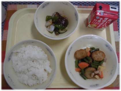 今日の給食は、ごはん、牛乳、平天の煮つけ、京野菜のごまみそかけです。