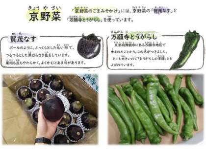京都府産の「賀茂なす」と「万願寺とうがらし」を使用した地産地消の献立です。「賀茂なす」や「万願寺とうがらし」は夏の京野菜の一つです。賀茂なす、万願寺とうがらしとこんにゃくを炒めたものに、教室でみそだれを田楽みそのようにかけて食べます。なすが苦手な児童もいましたが、みそだれにつけて食べるとおいしかった!と教えてくれました。