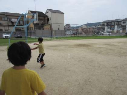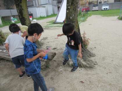 生活単元の時間に、夏の遊びでシャボン玉を作りました。シャボン玉はハンガーで作ったり、棒に毛糸をつなげたもので作ったり、好きな形にしたモールで作ったりしました。ハンガーや棒に毛糸をつなげて作ったシャボン玉は、大きいものができ、子どもたちは大喜びでした。振り返りで、「大きなシャボン玉が作れてよかった。」や「いろいろな大きさのシャボン玉が作れて楽しかった。」「また、したい。」などと話していました。