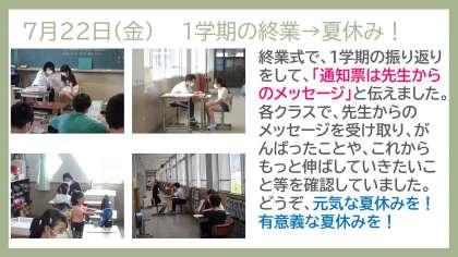 本日,1学期の終業式を行い,そのあとクラスで振り返りや夏休みの準備等を行い,一人一人,通知票とともに先生からのメッセージを受け取っていました。お家でも,通知票を基に,お子たちの1学期のがんばりを確認して,今後に生かしてくださいますよう,どうぞよろしくお願いいたします。